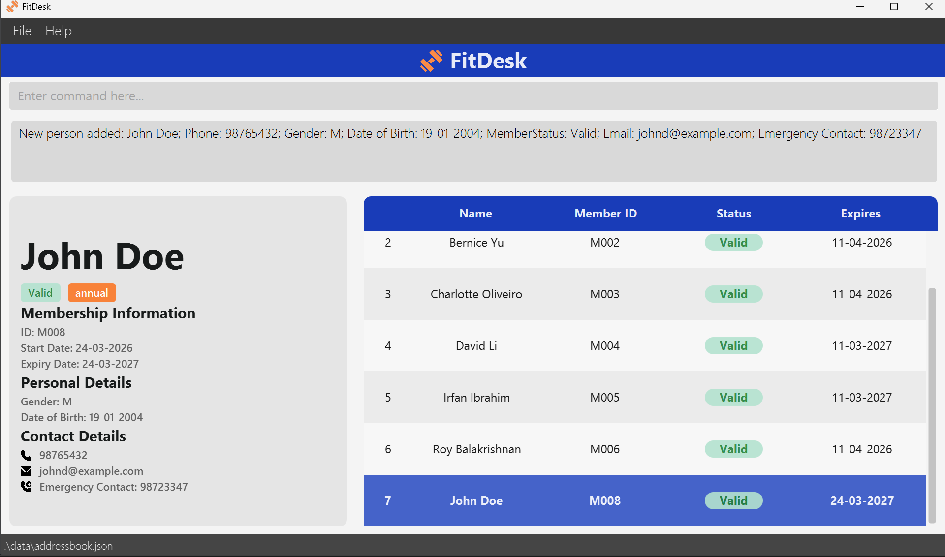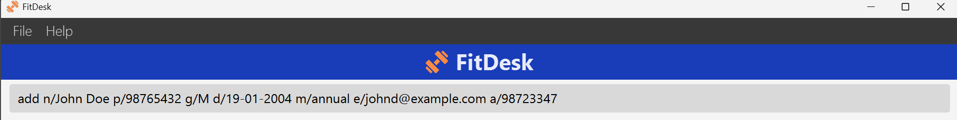 | Add | add n/NAME p/PHONE_NUMBER g/GENDER d/DATE_OF_BIRTH m/MEMBERSHIP_TYPE e/EMAIL ec/EMERGENCY_CONTACT e.g., add n/James Ho p/82224444 g/M d/14-05-2001 m/annual e/jamesho@example.com ec/99502281 |