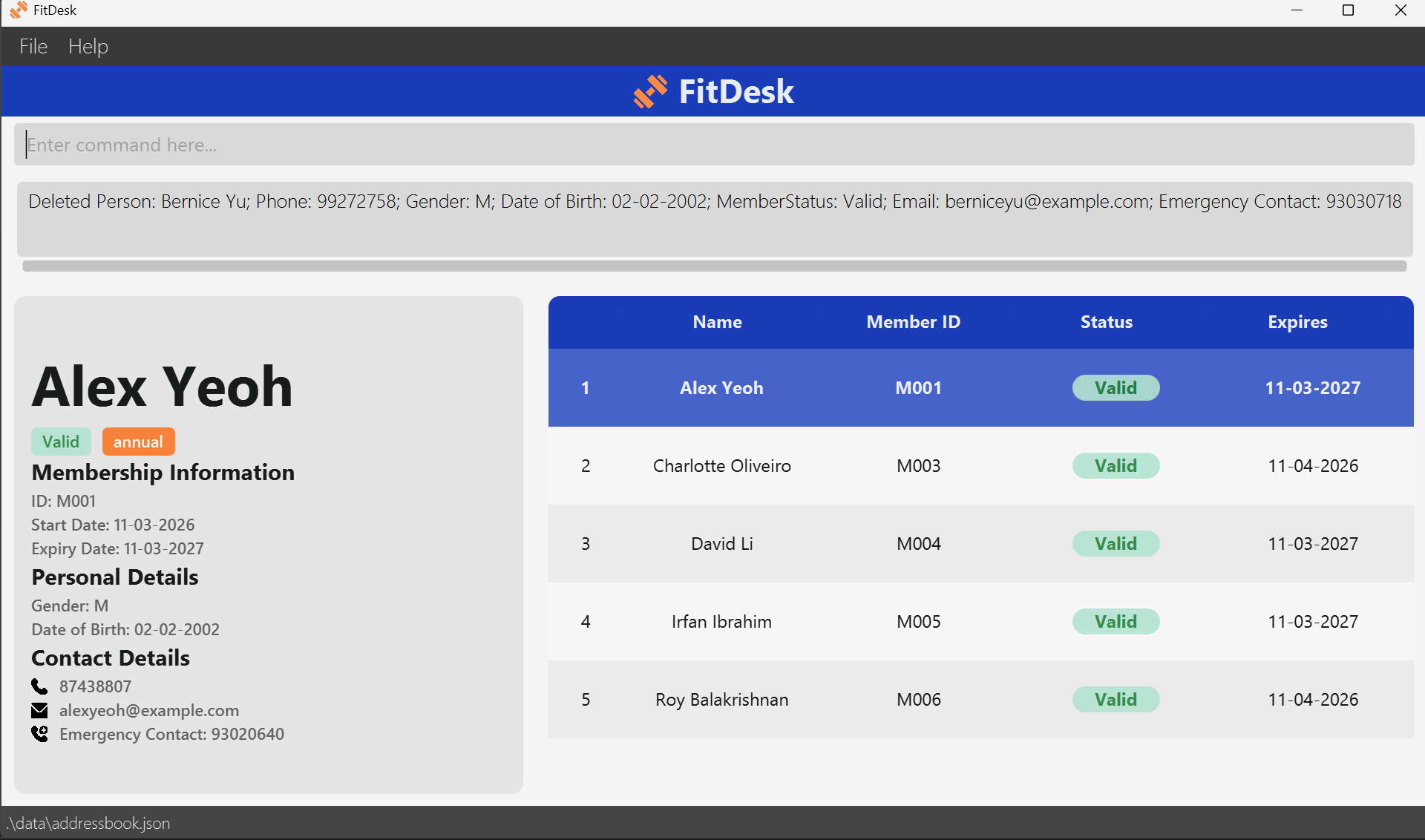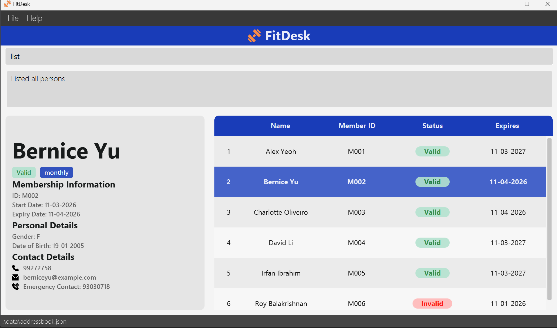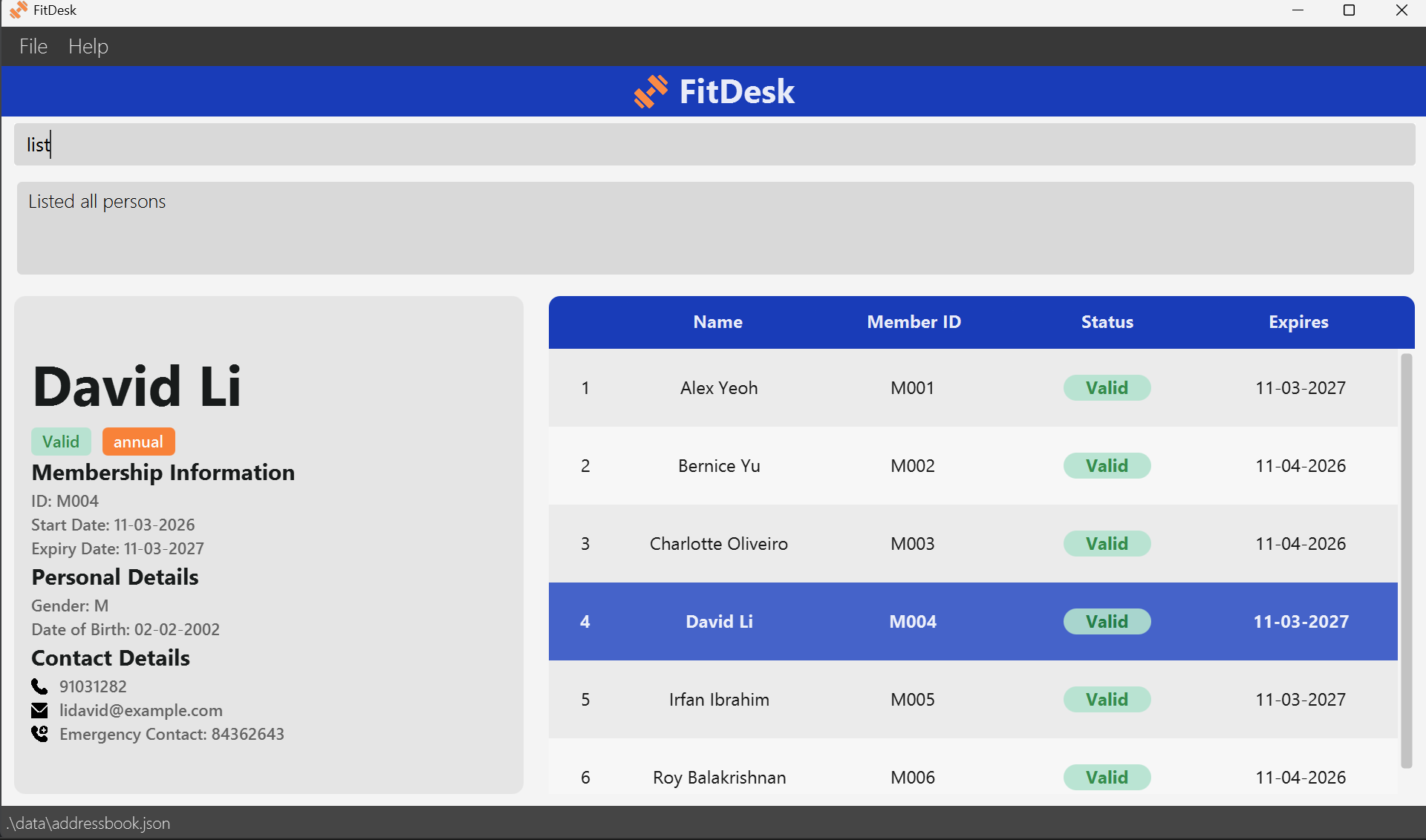 FitDesk data are saved automatically as a JSON file [JAR file location]/data/addressbook.json. Advanced users are welcome to update data directly by editing that data file.