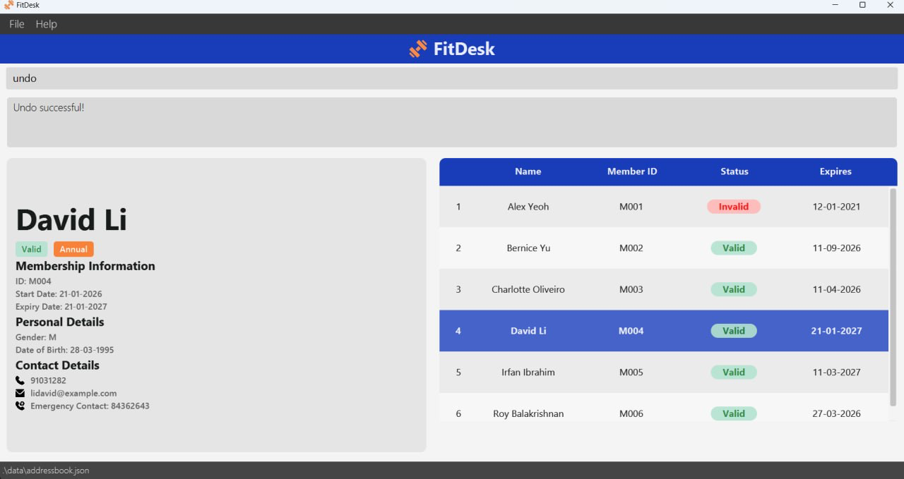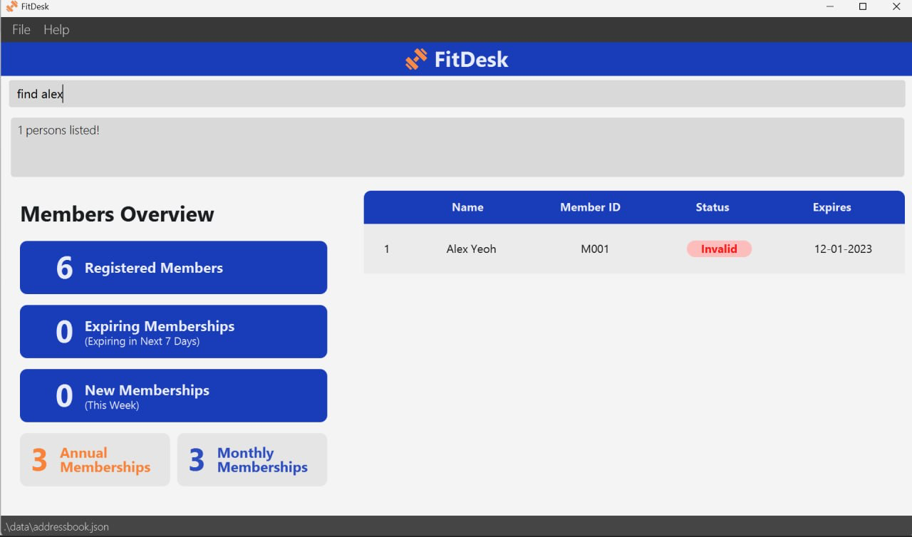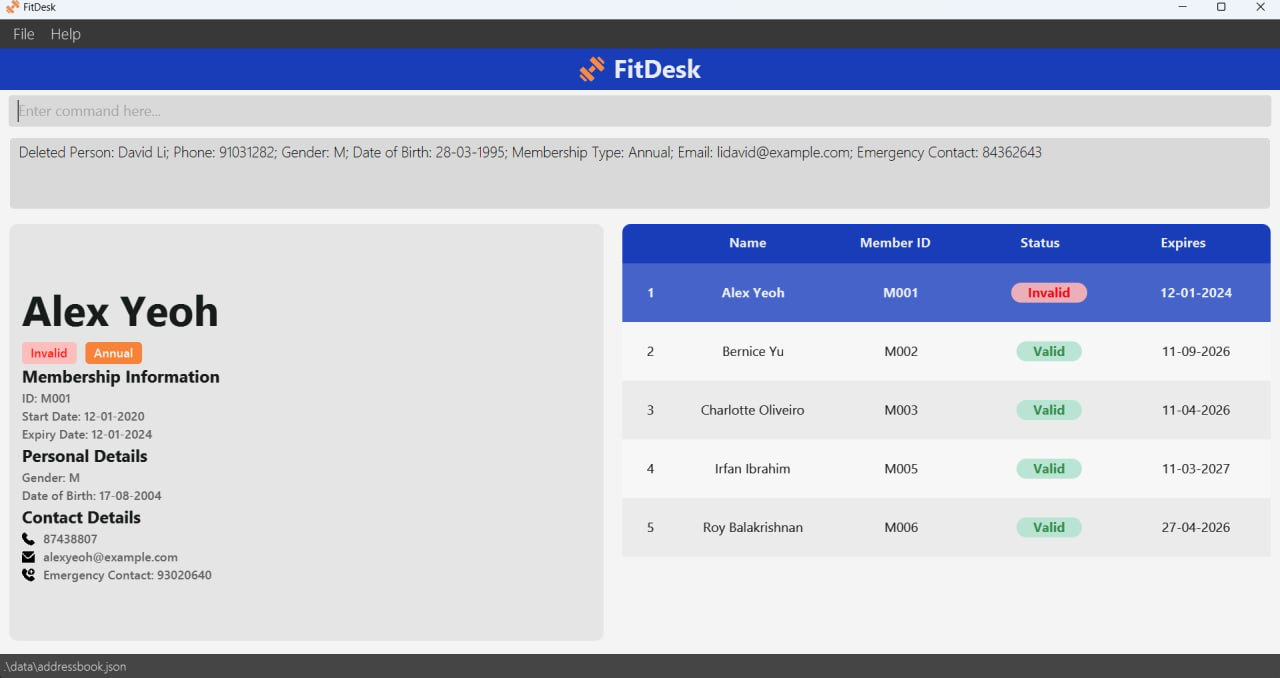 FitDesk data are saved automatically as a JSON file [JAR file location]/data/addressbook.json. Advanced users are welcome to update data directly by editing that data file.